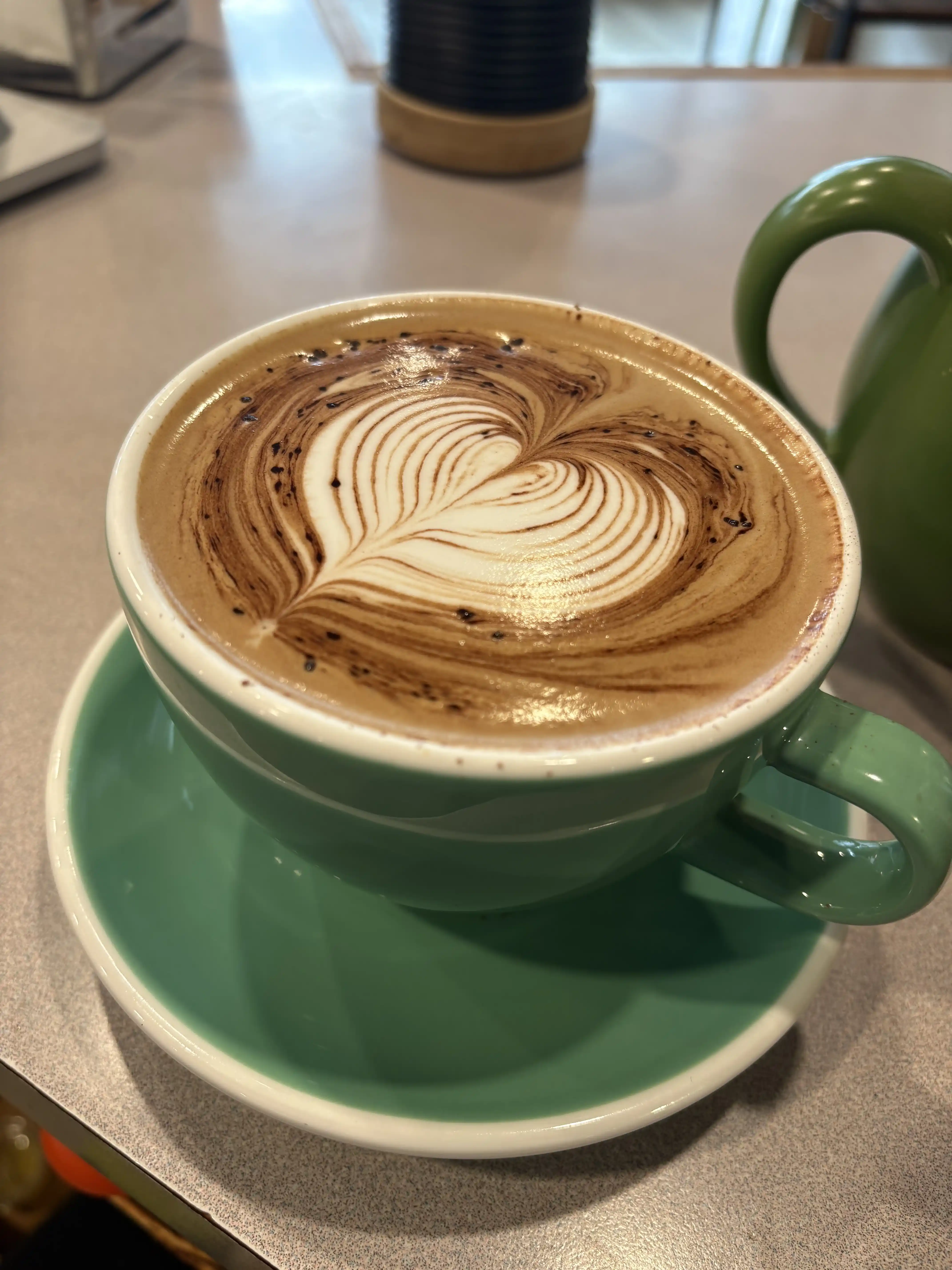 Whisked green tea with steamed milk, smooth and earthy with a gentle sweetness.